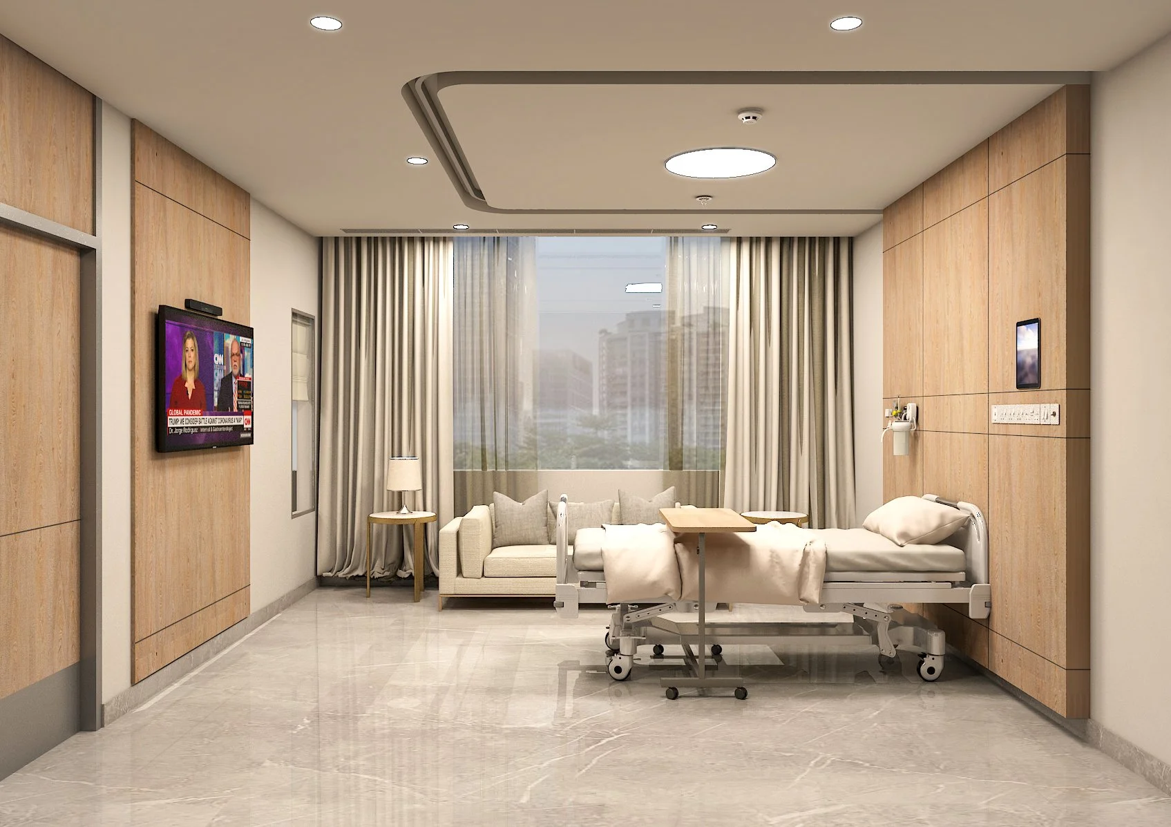 The design balances durable, hygienic finishes (engineered stone, antimicrobial wall assemblies) with tactile, humanizing elements (wood veneers, soft upholstery). Indirect cove lighting, warm accent fixtures and backlit ceilings in key public spaces create a calm, reassuring atmosphere without compromising clinical rigor.