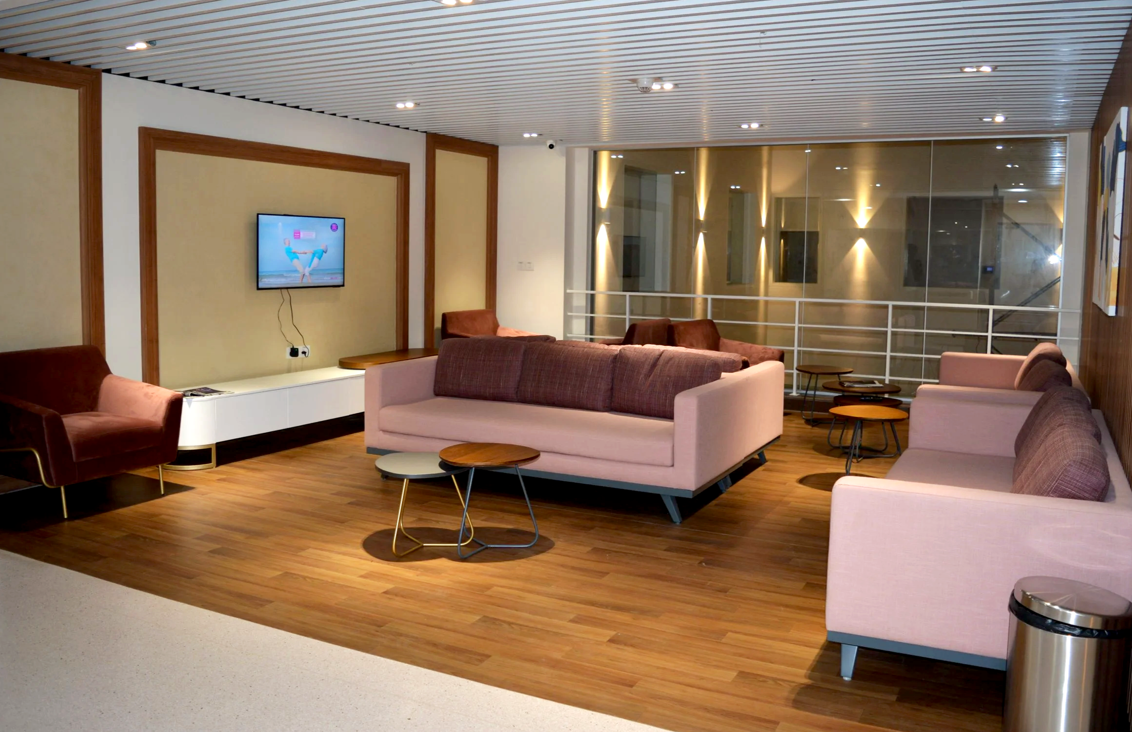 The waiting area is conceived as a warm, lounge-like retreat within the hospital, prioritizing comfort and emotional ease for families. The space features a coordinated ensemble of pastel-toned sofas and armchairs, arranged to promote both privacy and social interaction. Soft upholstery, paired with low, minimalist coffee tables, gives the area a domestic, contemporary ambiance.