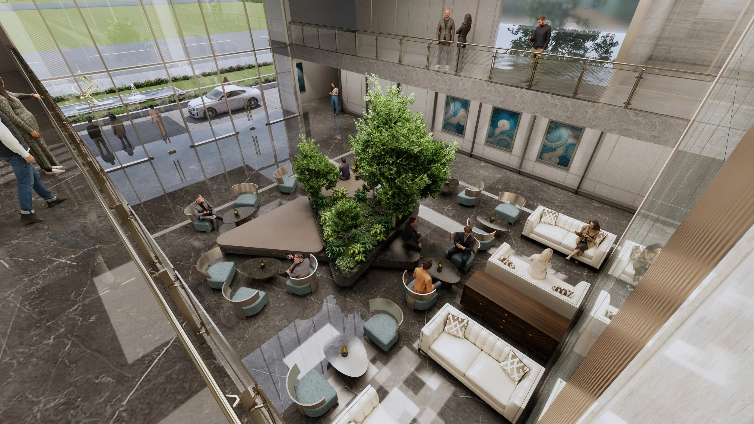 Inside, the triple-height atrium is the centerpiece: a central biophilic installation anchors the visual experience, surrounded by layered seating, custom furniture, and soft accent lighting. Travertine wall finishes, brushed metal railings, and large-format stone flooring add tactile richness, while contemporary artwork and dynamic chandeliers animate the social spaces. The reception blends elegance and approachability through warm tones, indirect illumination, and a welcoming desk composition.